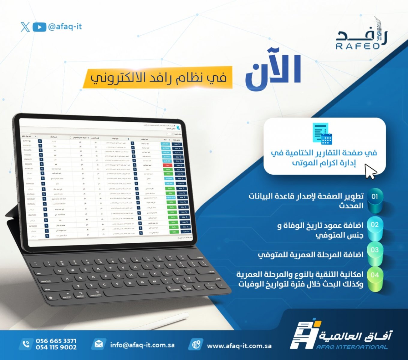 فى الأونة الأخيرة اعتمد كثير من الجمعيات نظام رافد الذى يعد نقطة تحول فى الميدان الخيرى حيث هو لبنة مهمة جدا فى تاريخ التحول التقنى إذ يعتمد على فريق دعم محترم يقدم أفضل الحلول ومخططات سير العمليات وتوزيع المهام واعتمادها وهى التى من خلالها استطعنا تحقيق نجاحات متميزة فى الموارد المالية وفى إدارة الخدمة المجتمعية وفى ضبط إدارة الموارد البشرية وتنظيمها.